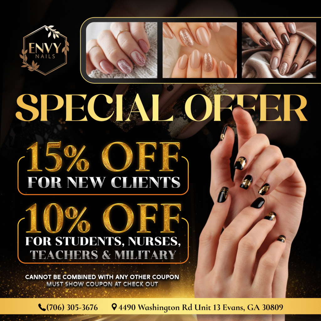 Located conveniently in Evans, GA 30809, Envy Nails and Spa is one of the best salons in this area. Envy Nails offers premier nails care and spa treatment services to satisfy your needs of enhancing natural beauty and refreshing your day.